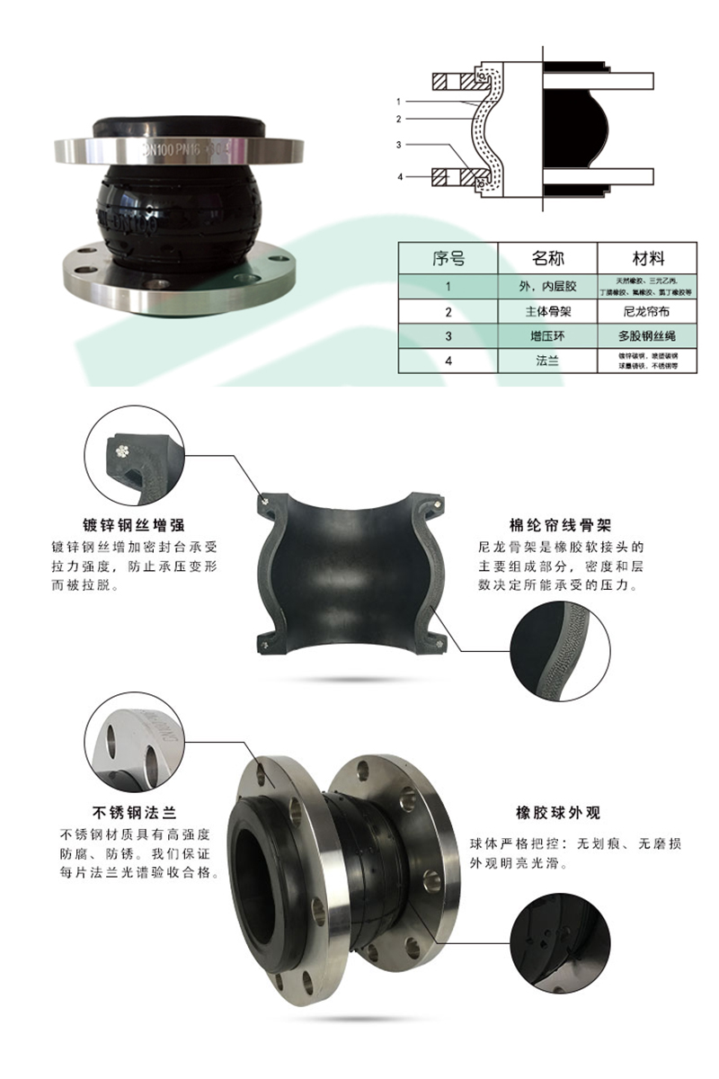 橡膠軟接頭一般由內膠層、織(zhī)物增強層(céng)(簾子布)、中膠層、外膠層、端部加固金屬環或鋼絲圈,經高溫(wēn)、高壓硫化成型後,與金屬法蘭或平行接頭鬆套組合而成的複合橡膠(jiāo)管,其(qí)使用壽命取決於簾子布(bù)的質量。