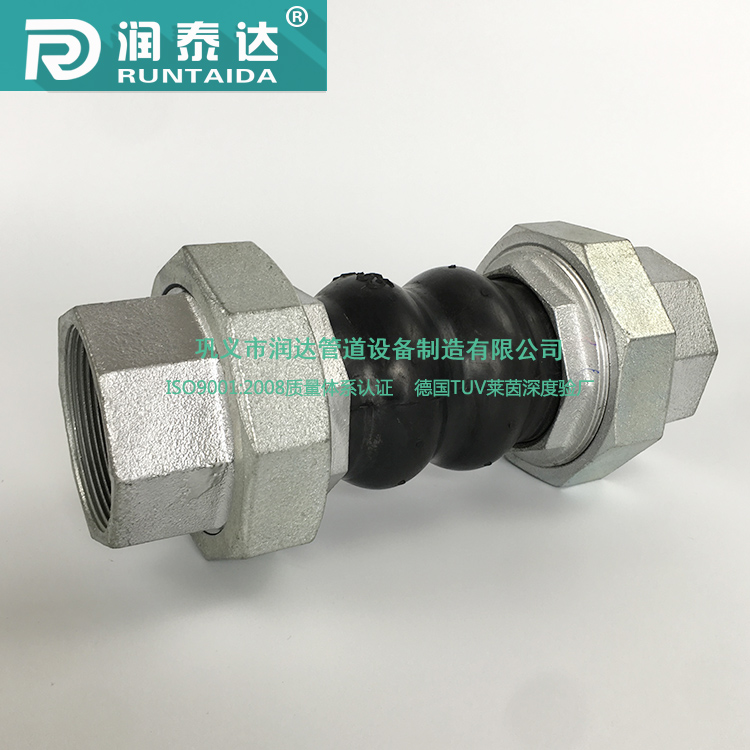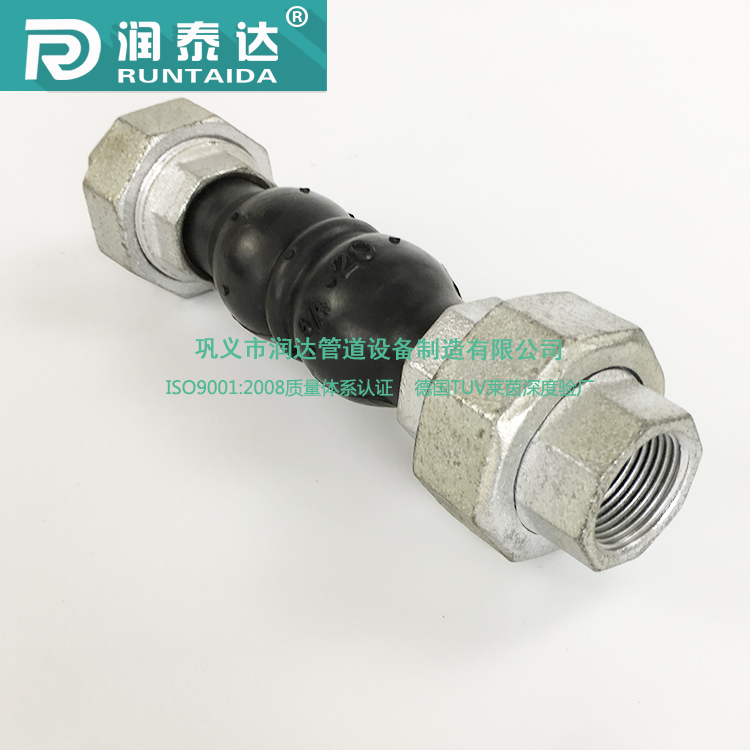 風機盤(pán)管橡膠接頭,是一種(zhǒng)適用於空(kōng)調係統風機盤管進出口水管連接的新(xīn)型軟性管道連接器件。該接頭吸振效果顯(xiǎn)著,承受壓力高〔1,6MPa )、耐溫(wēn)性能好(-10^-10590 ),具有(yǒu)較大的自由偏轉和位移(yí)量,而兩端采用螺紋(wén)接口,因此安裝使用方便。橡(xiàng)膠接頭主要由橡膠主(zhǔ)體、尼龍簾布內襯、鋼絲繩骨架與鋼製法蘭有(yǒu)機組合而成,兩端法蘭(lán)在橡膠主體上可作360“任意旋轉,特別便於(yú)施工安裝。